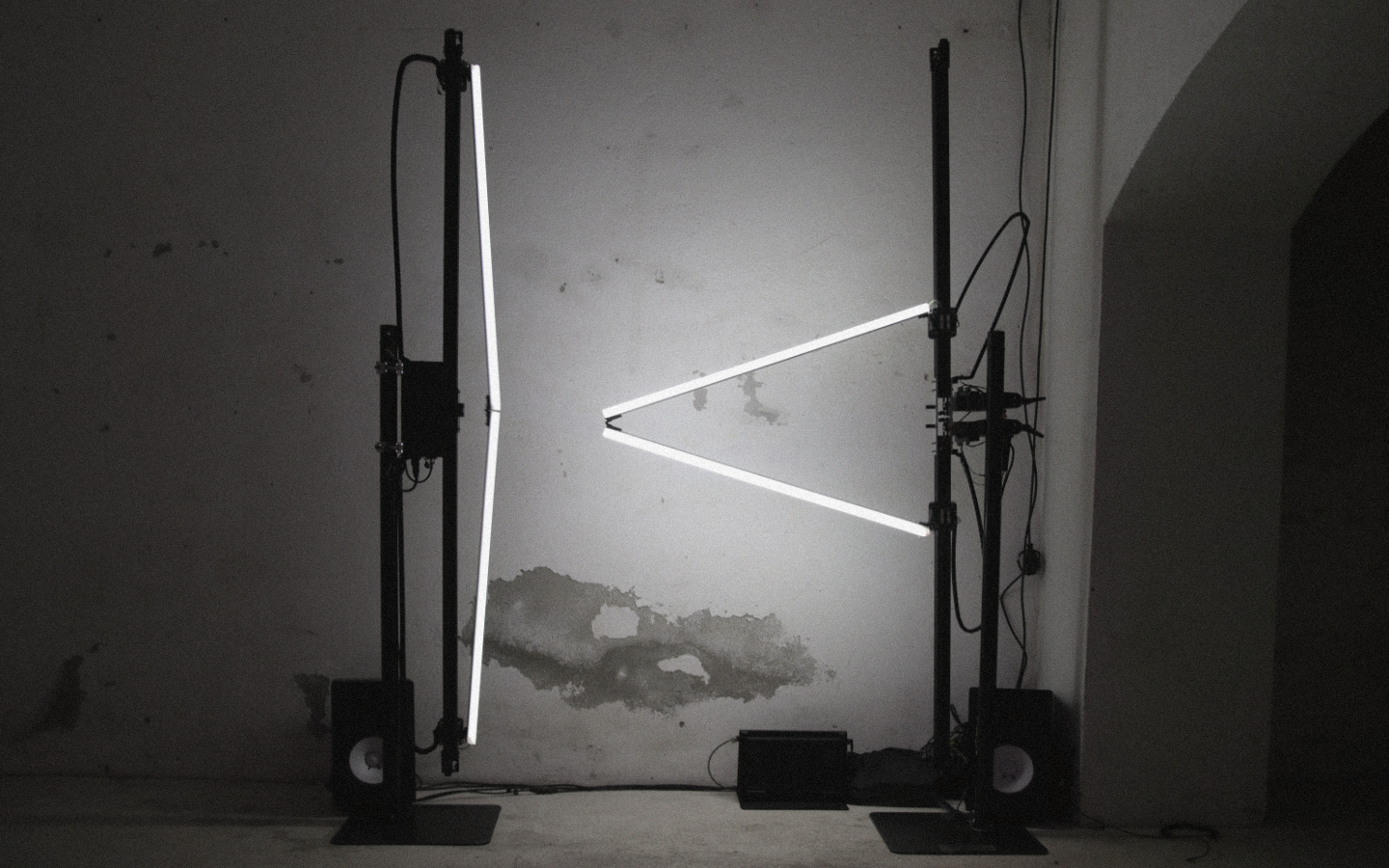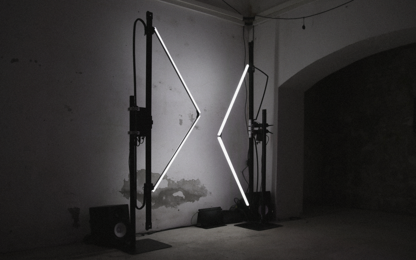 Central to the project is an ensemble of computer-aided performers: hybrid, non-human actors whose expression emerges from the relation between human intention and machine execution. Each performer consists of two one meter LED segments connected by joints and driven by servo motors.
